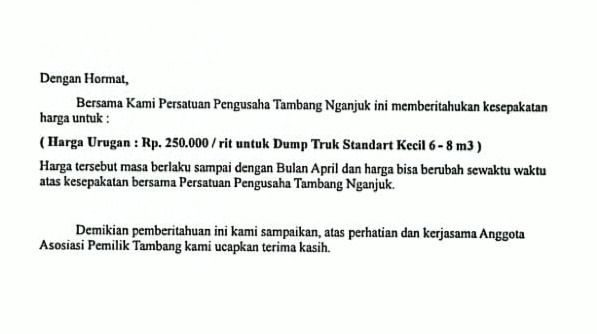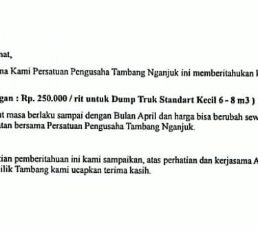 Di tengah polemik ini, pada Sabtu (8/2/2025), beredar surat dari Persatuan Pengusaha Tambang Nganjuk yang beralamat di Perum Tanjung Green Regency Blok D16, Nganjuk. Surat tertanggal 7 Februari 2025 yang ditandatangani oleh Wibisono Wijanto itu menetapkan harga tanah urug sebesar Rp250 ribu per rit untuk armada berkapasitas 6–8 m³.