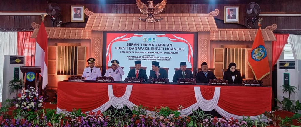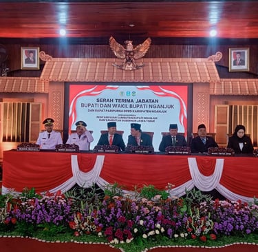 ARTIKATA, NGANJUK -- Kabupaten Nganjuk resmi memasuki era kepemimpinan baru setelah prosesi Serah Terima Jabatan (Sertijab) Bupati dan Wakil Bupati Nganjuk yang digelar di Pendapa KRT Sosro Koesoemo, Rabu (5/3/2025) siang.